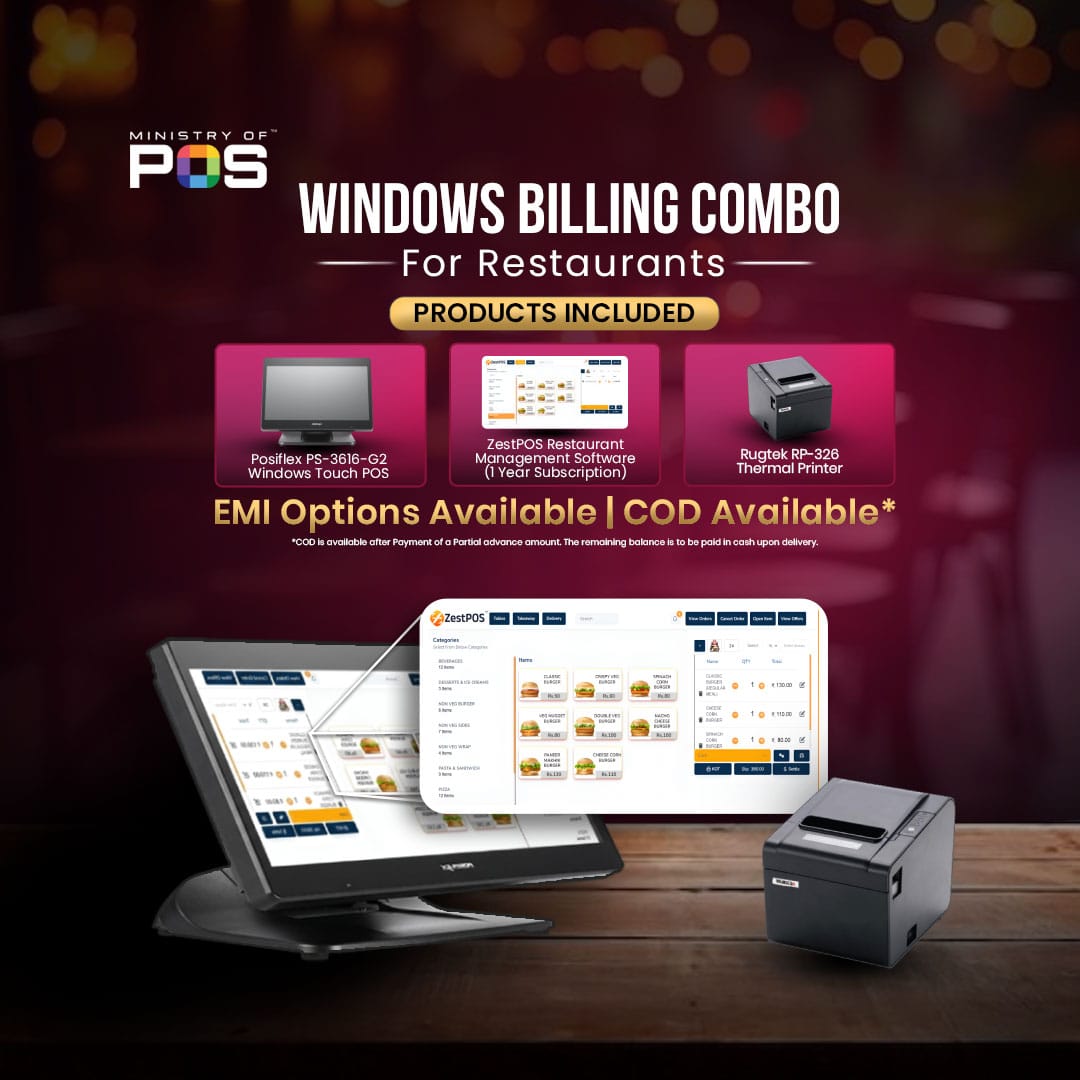 The Posiflex PS-3616 G2 Windows Touch POS Combo with ZestPOS Software is a complete and reliable billing solution designed for restaurants looking for efficient POS operations. Powered by an Intel Quad-Core J6412 processor, the Posiflex PS-3616 G2 delivers smooth and fast performance for everyday billing and store management tasks. This combo includes 4 GB RAM and 128 GB storage, ensuring stable performance for POS applications and data handling. A 3-years on-site warranty, making it a dependable long-term investment for businesses. The package also features the Rugtek RP-326 3 Inch Thermal Printer, which provides fast and clear receipt printing with a 1-year carry-in warranty. To streamline business operations, the combo includes 1-year ZestPOS software, offering powerful features such as offline touch POS billing, stock management, menu management, KOT (Kitchen Order Ticket) management, table management, single-user login access, and GSTIN reporting. This integrated POS combo helps businesses manage sales, inventory, and billing efficiently while maintaining compliance with GST requirements.